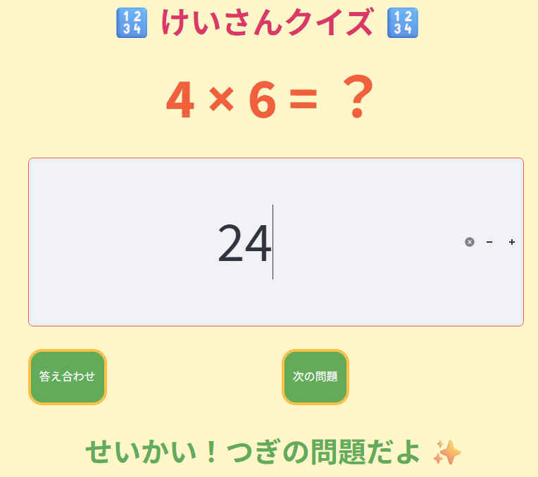 • 追加指示: 「入力欄に数字を入れた後にエンターキーを押したら、答え合わせを行い、合っていたら次の問題を表示するようにして。」