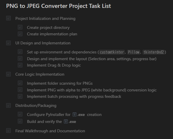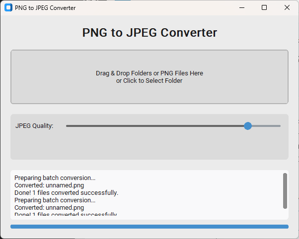 「Windowsで動く、PNGからJPEGへの一括変換ツールを作って。背景が透明なPNGは白背景にしてから保存するようにして。UIは最新のWindowsっぽいモダンな感じ(CustomTkinterなど)で、フォルダをドラッグ&ドロップするか、ボタンで選択できるようにしたい。最終的に配布可能なexeにするところまでリードして」