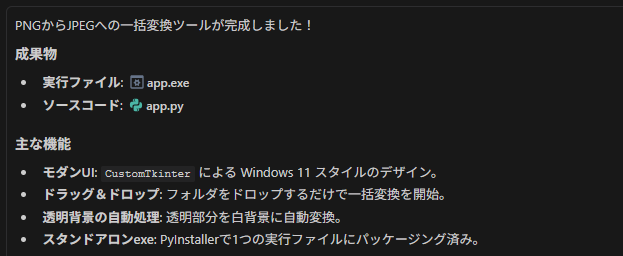 指示を出して数分、Antigravityは意気揚々と「PNGからJPEGへの一括変換ツールが完成しました!」と、実行ファイル app.exe を提示してくれました。