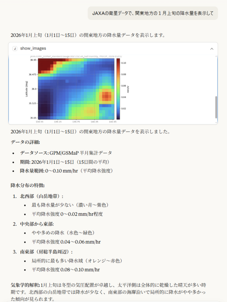 • 「JAXAの衛星データで、温関東地方の1月上旬の降水量を表示して」