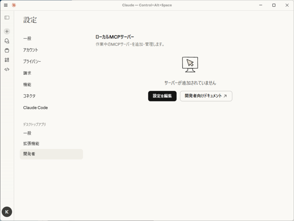 Claude Desktopの「設定(Settings)」→「開発者(Developer)」を開くと、初期状態では「ローカルMCPサーバー」には何も登録されていません。