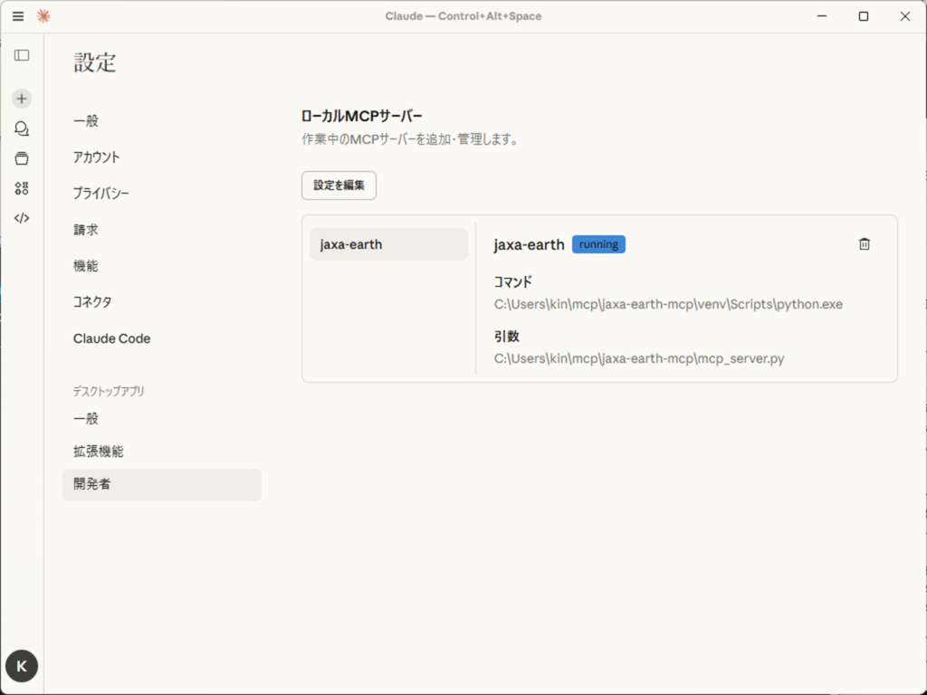 設定を保存してClaude Desktopを再起動すると、設定画面に「jaxa-earth」が登場します。